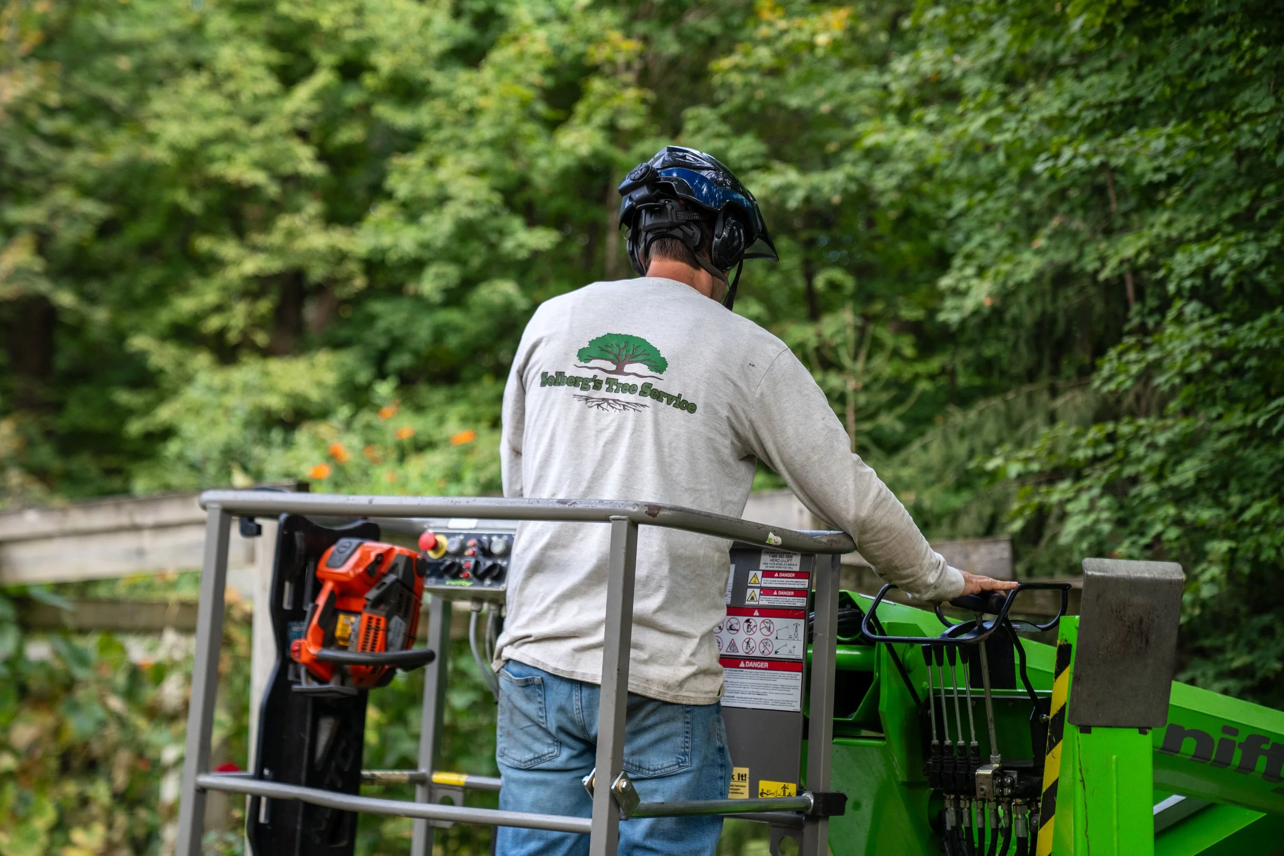 Zach operating a lift to trim tall branches during a residential tree care project.