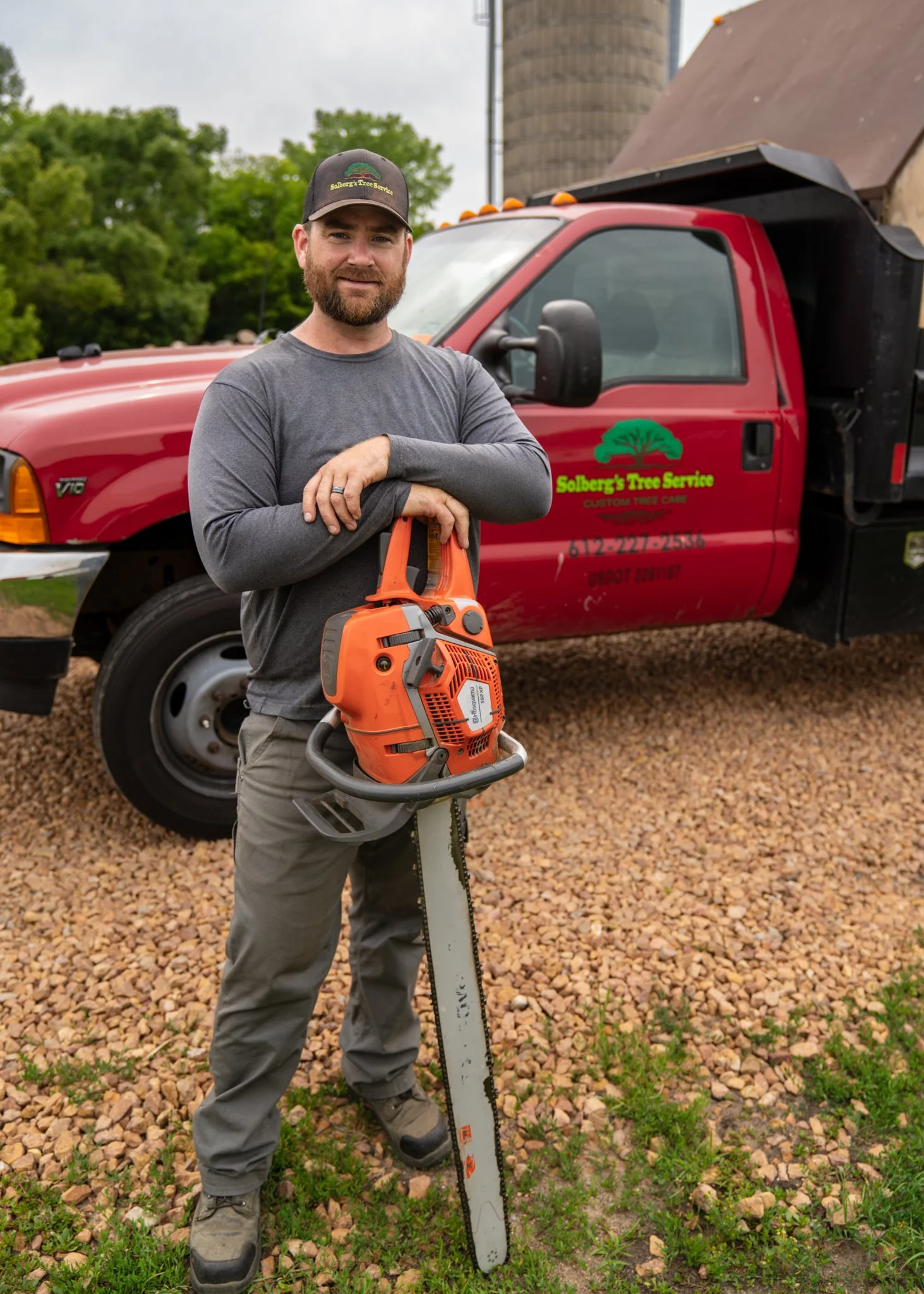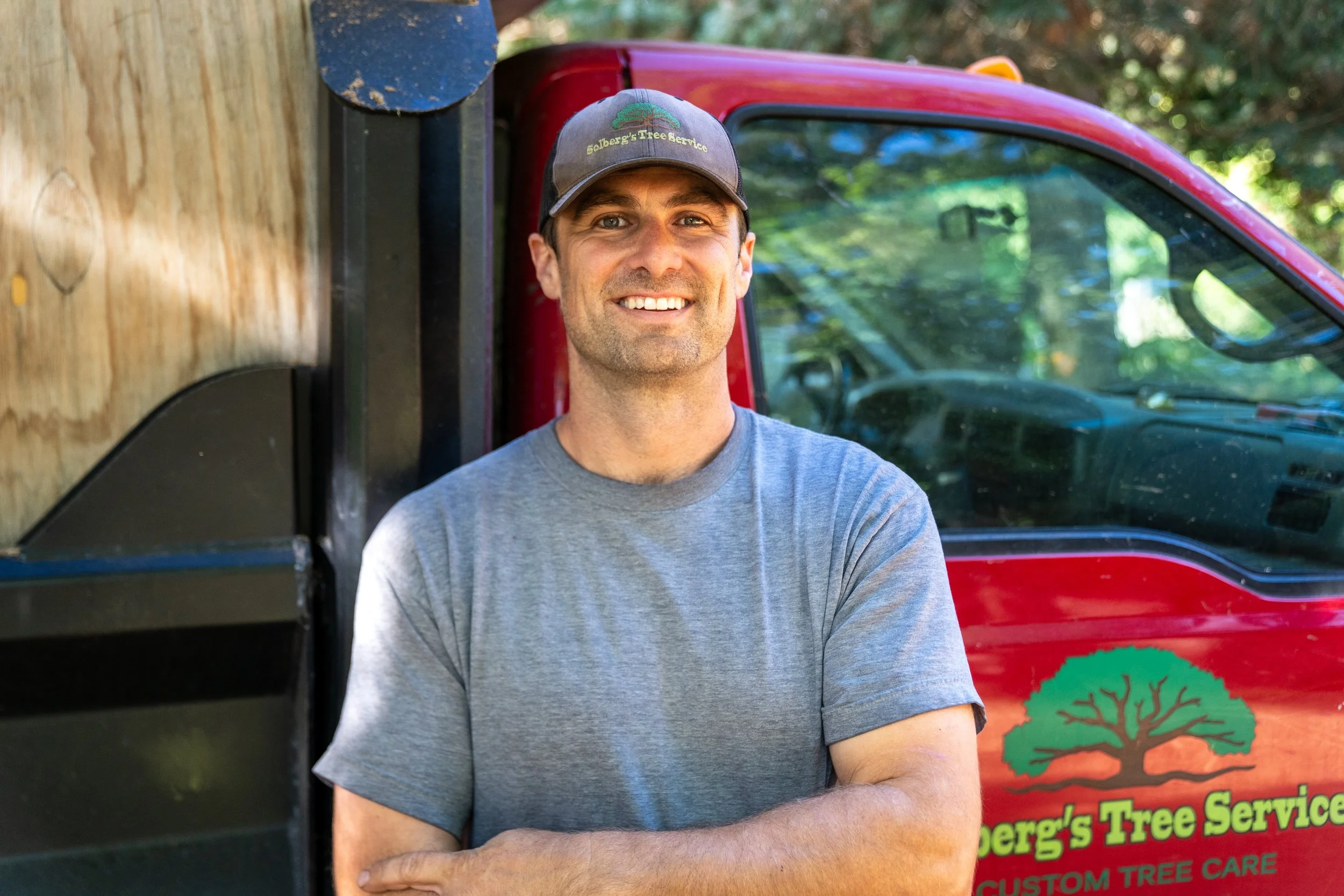 Zach from Solberg’s Tree Service standing proudly next to company truck.