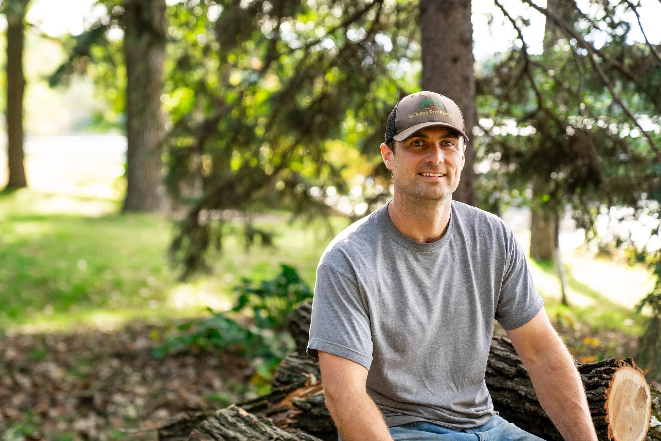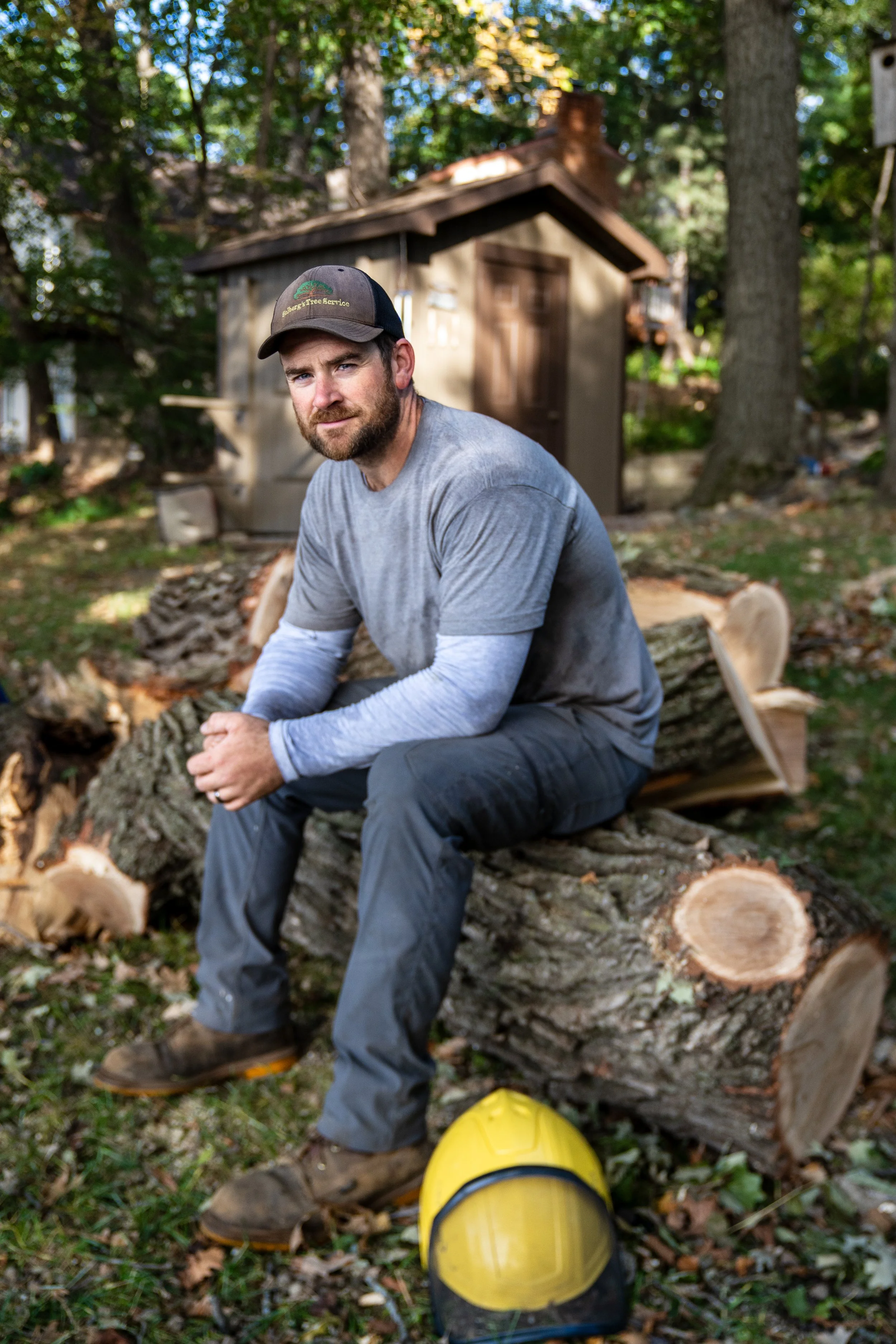 Ryan, crew member sitting on logs after a completed tree removal project in Minnesota.