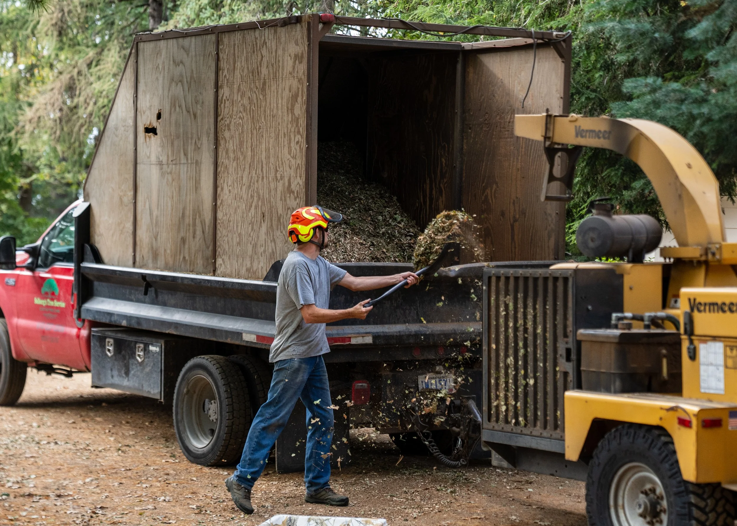 Solberg’s Tree Service team members loading cut branches for disposal during a cleanup project.
