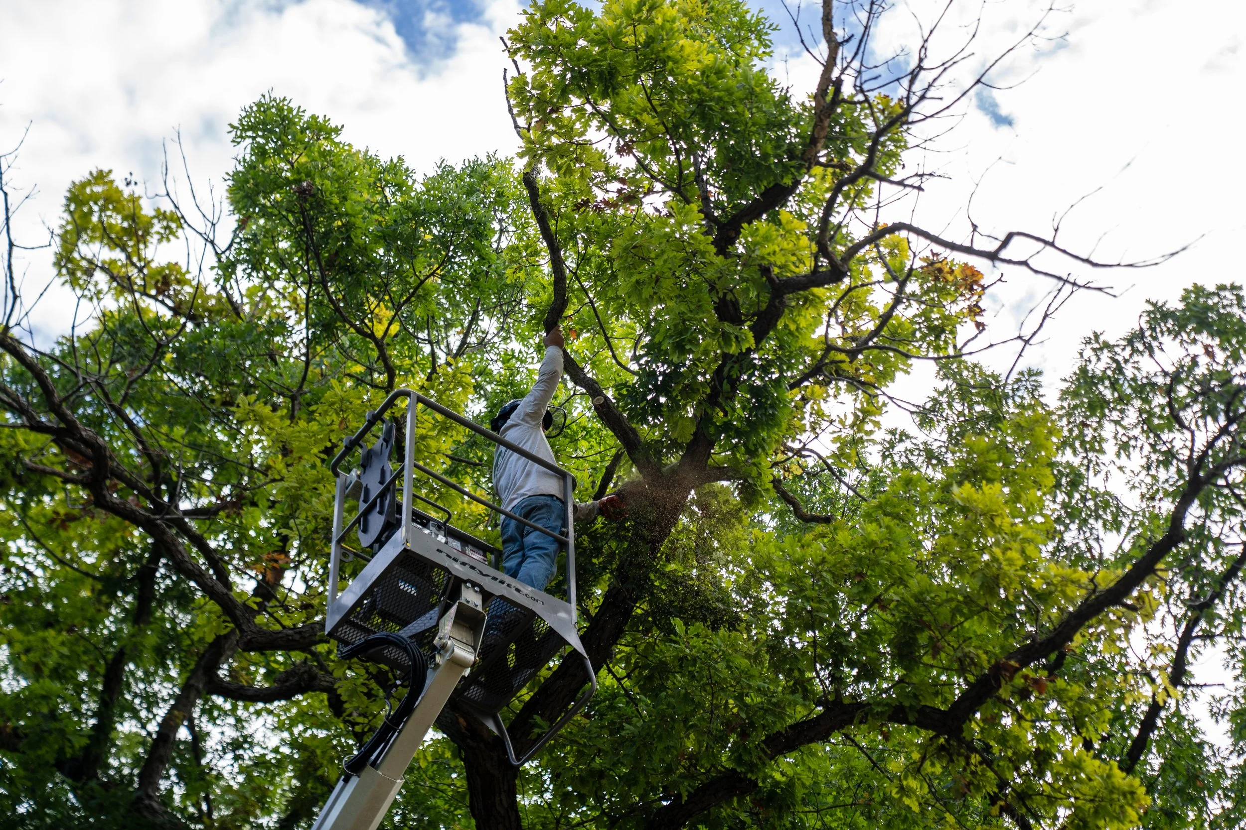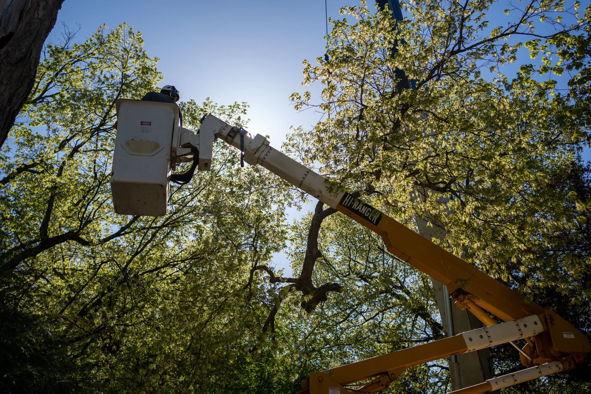 Crew member trims tall branches from a bucket truck, ensuring safe and effective maintenance for mature trees.