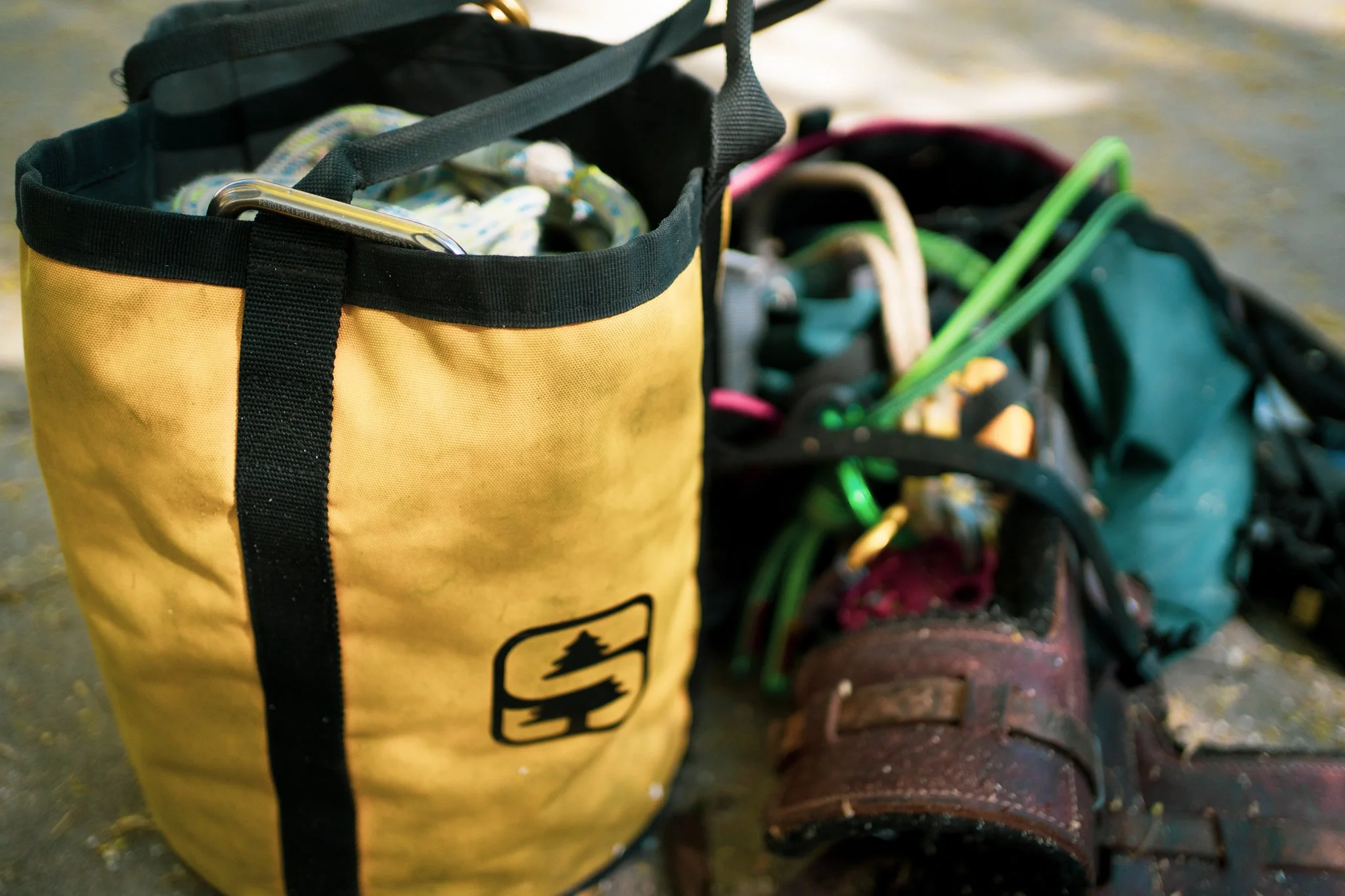 Helmets, ropes, and harnesses organized and ready for use, demonstrating Solberg’s focus on safety and professionalism.