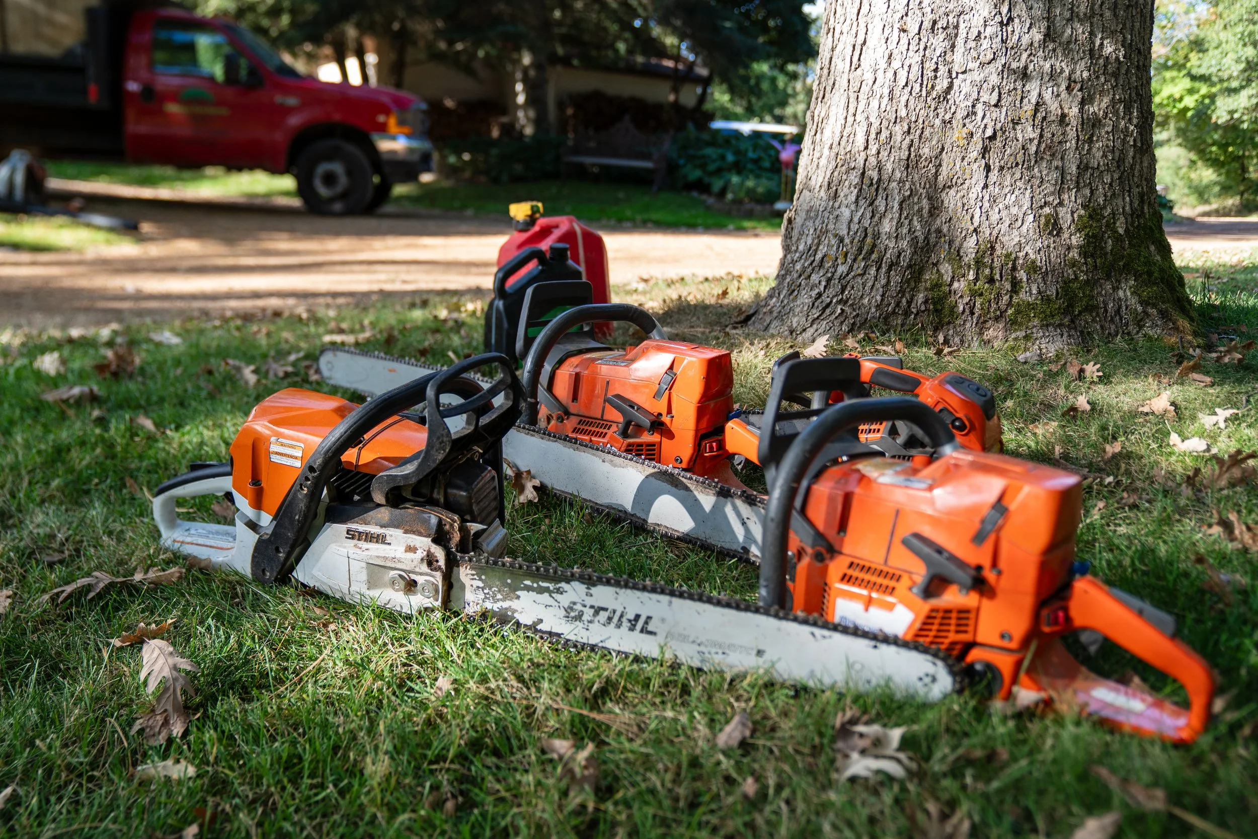 Chainsaws and equipment lined up and ready for the next tree service project.