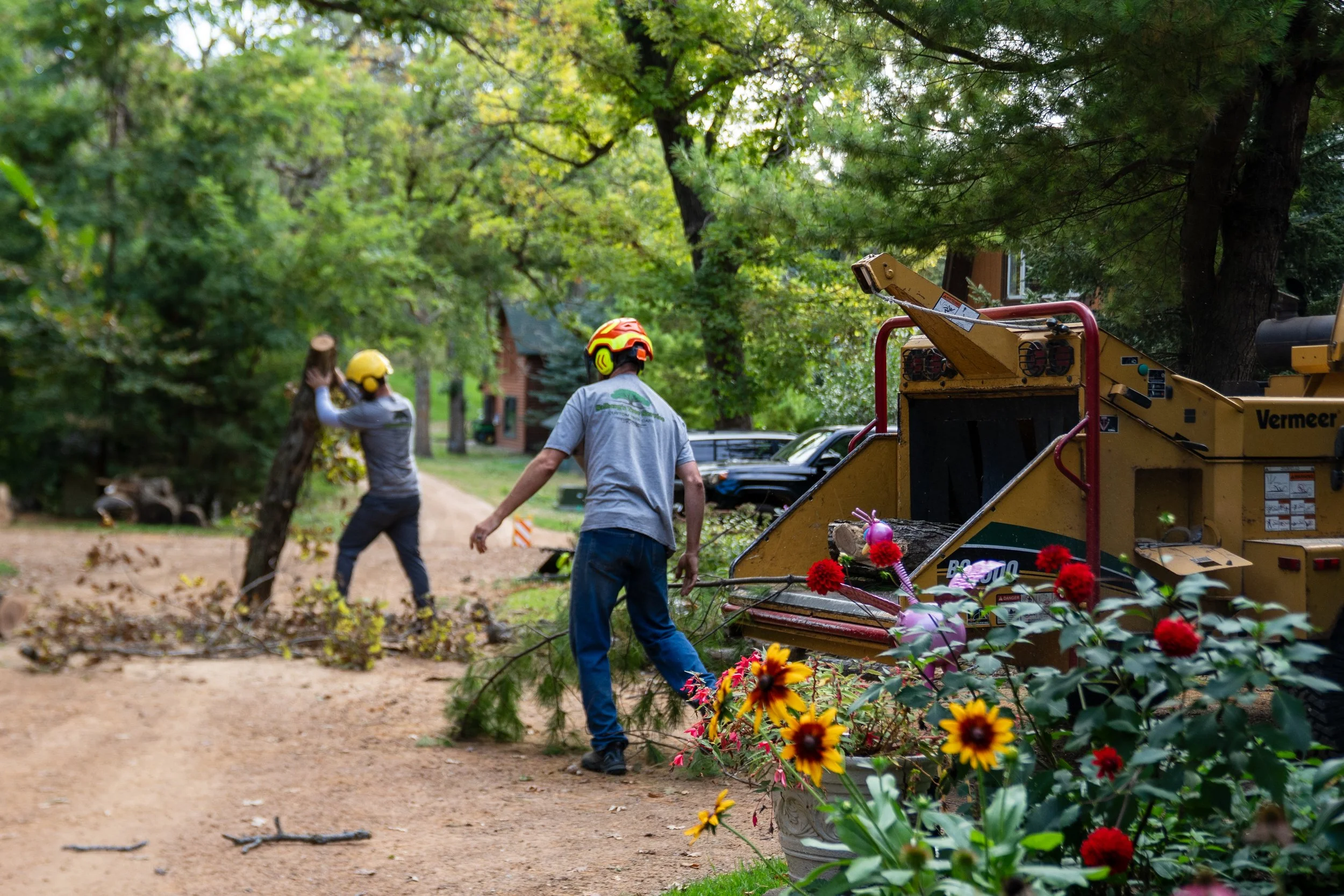 Crew trimming and cleaning up a residential property as part of Solberg’s full-service tree care.