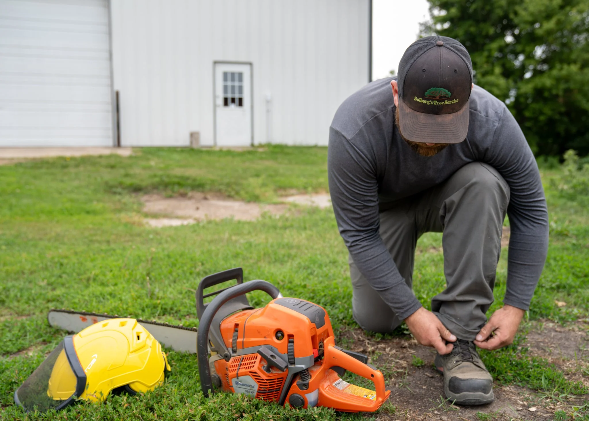 Zach from Solberg’s Tree Service prepares chainsaw and safety gear before a job.